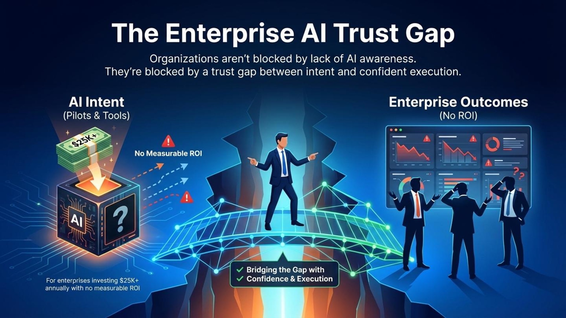 Organizations are not blocked by lack of awareness or access to AI, but by a trust gap—a gap between intent and confident execution. This is particularly relevant for medium to large enterprises that already allocate $25K+ annually toward automation and AI, but struggle to convert that spend into measurable business impact.